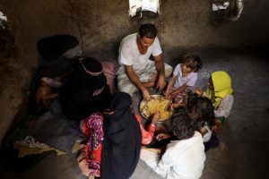 علي العمادي ، الذي يعمل حطابًا ، يتناول الغداء مع أسرته في منزلهم بقرية بمديرية خميس بني سعدبمحافظة المحويت ، اليمن.