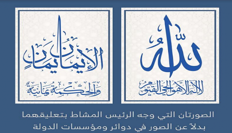 وجّه الرئيس مهدي المشاط، اليوم الأربعاء، بإنزال الصور من جميع مكاتب ومؤسسات الدولة ورفع صور لفظ الجلالة “الله لا إله إلا هو الحي القيوم”، والحديث الشريف “الإيمان يمان والحكمة يمانية”.