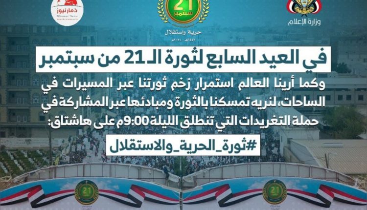 دعا وزير الإعلام ضيف الله الشامي، للمشاركة الواسعة في حملة التغريدات التي تنطلق الساعة التاسعة من مساء اليوم الثلاثاء، على موقع التواصل الاجتماعي “تويتر”، بمناسبة العيد السابع لثورة 21 سبتمبر المجيدة.