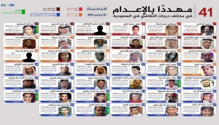 أعربت المنظمة الأوروبية السعودية لحقوق الإنسان في سلسلة تغريدات عبر حسابها على “تويتر” عن خشيتها على حياة نحو 41 معتقلًا في المملكة السعودية، جراء تعرّضهم لمحاكمات غير عادلة بعد سجنهم بشكل تعسّفي.