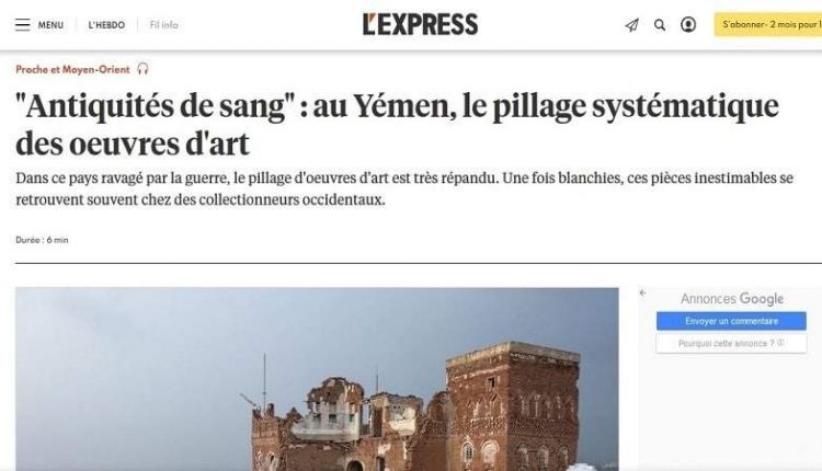 وكشفت صحيفة “ليكسبريس” الفرنسية في تحقيق لها تحت عنوان “هكذا يتم تهريب (تحف الدم) من اليمن”، أن في اليمن الذي دمرته الحرب ينتشر نهب الآثار على نطاق واسع، وبمجرد قصف المواقع الأثرية تجد قطع الآثار التي لا تقدر بثمن في حوزة جامعي التحف الغربيين.