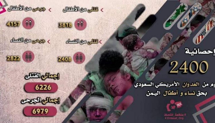وحمّلت رئيسة منظمة “انتصاف”، سمية الطائفي، تحالف العدوان بقيادة أمريكا والسعودية المسؤولية عن كل الجرائم والانتهاكات بحق المدنيين خاصة النساء والأطفال، على مدى 2400 يوم.