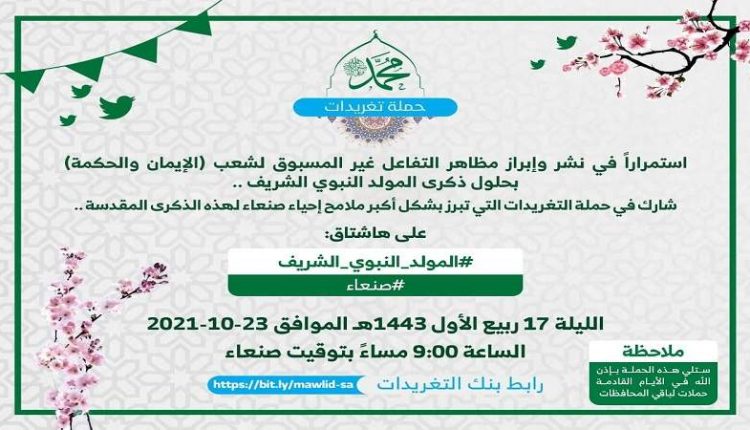 ودعا المنظمون، إلى أهمية المشاركة الواسعة في حملة التغريدات لإبراز ملامح إحياء صنعاء لهذه المناسبة الدينية بشكل أكبر.