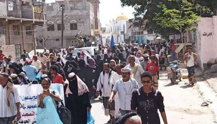 ودعا المحتجون إلى الإلتحام بمظاهرات عدن وإغلاق قصر معاشيق ومقر قوات تحالف العدوان ومطار عدن.