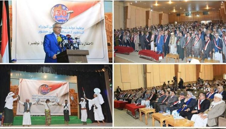 وفي الحفل، اعتبر رئيس الوزراء، الدكتور عبدالعزيز صالح بن حبتور، الـ30 من نوفمبر المجيد يوماً خالداً في تاريخ اليمن.