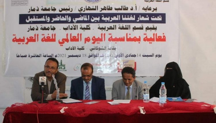 وفي الفعالية التي شارك فيها عدد من الأكاديميين في جامعة ذمار، دعا نائب رئيس الجامعة للشؤون الأكاديمية أ.د. عبد الكريم زبيبه إلى التوسع في خلق ثقافة معرفية باللغة العربية وربط أكثر المجتمع باللغة العربية باعتبارها لغة القران الكريم والحد من ارتفاع منسوب اللهجة العامية في التعاملات اليومية.