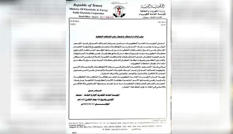 أدانت المؤسسة العامة للكهرباء، إمعان العدوان الأمريكي السعودي، في منع دخول المشتقات النفطية إلى ميناء الحديدة وفرض حصار جائر على الشعب اليمني.