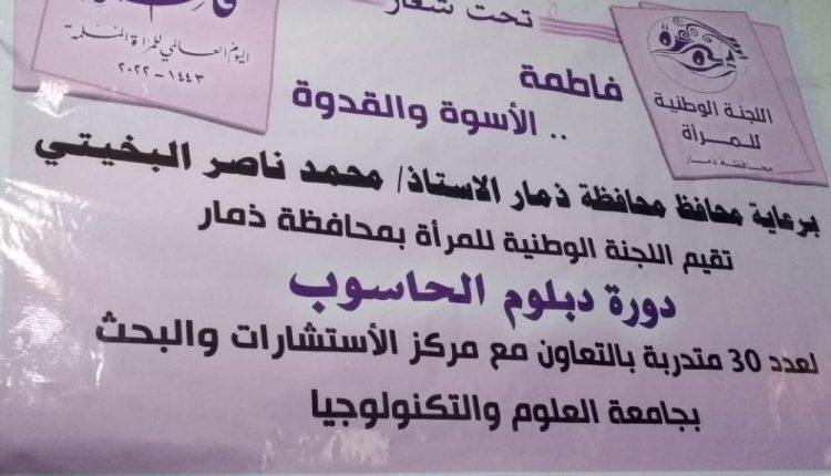 بدأت اليوم بذمار دورة تدريبية في مجال دبلوم الحاسوب، ينفذها فرع اللجنة الوطنية للمرأة بالمحافظة بالتعاون مع مركز الاستشارات والبحث بجامعة العلوم والتكنولوجيا.