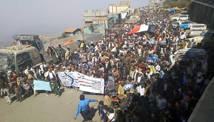 ورفع المشاركون في المسيرة بمركز المحافظة، اللافتات المستنكرة للإرهاب الأمريكي السعودي الإماراتي، وما يرتكبه التحالف من جرائم وتصعيد العدوان بحق الشعب اليمني واستمرار القرصنة البحرية واحتجاز سفن الوقود ومنع دخولها إلى موانئ الحديدة.