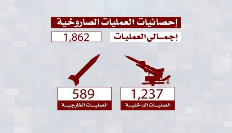 مؤكداً انه وخلال معركة الحرية والاستقلال المستمرة حتى يومنا هذا نفذت القوة الصاروخية بعون الله 1826 عملية عسكرية منها 1237 عملية استهدفت تجمعات العدو وتحشيداته ومعسكراته ومقراته داخل أراضينا الوطنية و589 عملية استهدفت العدو خارج جغرافيتنا الوطنية منها عمليات استهدفت عمق العدوين السعودي والاماراتي.