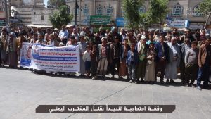 نددت وقفة احتجاجية للمنظمات الحقوقية والمجتمع المدني والناشطين بمحافظة ذمار اليوم الاثنين، بالجريمة التي ارتكبها النظام السعودي بإعدام الشاب محمد عبدالباسط المعلمي.