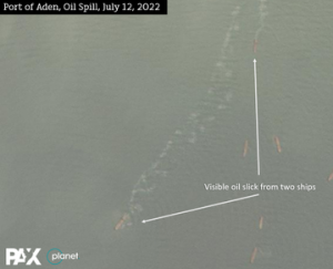 وقال “ويم زويجنينبورغ” رئيس مشروع نزع السلاح الانساني في(تصوير الفضاء الأوروبي) ، على حسابه في تويتر “لا يزال ميناء عدن يواجه مصادر متعددة للتلوث النفطي، بدءًا من 5 يوليو مع تسرب نفطي بسمك 14 كيلومترًا مرئيًا ، على الأرجح من سفينة واحدة”.