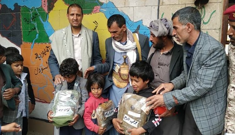 دشن فرع مؤسسة الشهداء بالشراكة مع الهيئة العامة للزكاة اليوم بمديرية مغرب عنس محافظة ذمار مشروع توزيع الحقيبة المدرسية لإبناء الشهداء والاسرى بالتزامن مع بداية العام الدراسي