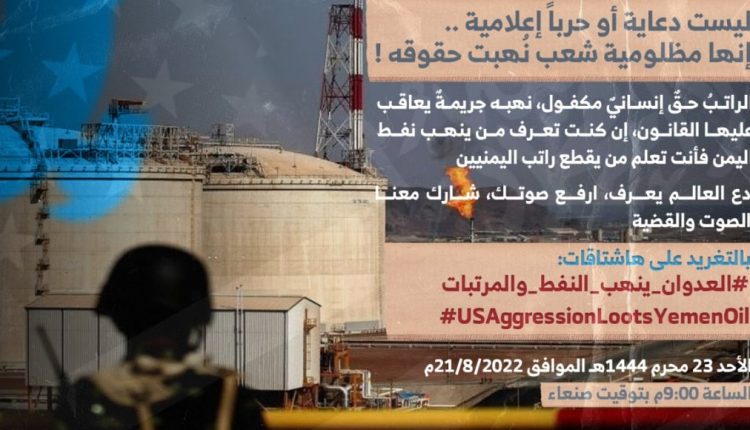 تنطلق الساعة التاسعة من مساء اليوم الأحد، حملة تغريدات ” العدوان ينهب النفط والمرتبات” على موقع التواصل الاجتماعي “تويتر”.