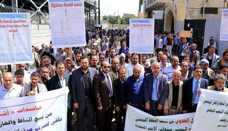 نظم موظفو شركة النفط اليمنية، اليوم الأحد، وقفة احتجاجية، أمام مكتب الأمم المتحدة بصنعاء، تنديدا بالحصار والقرصنة على سفن المشتقات النفطية.