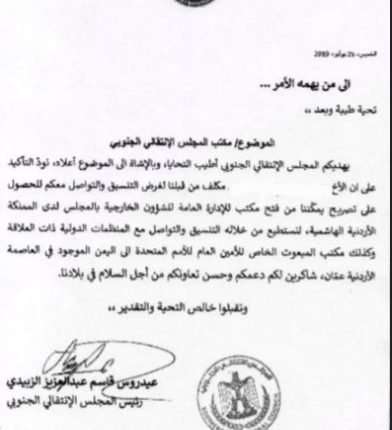 وقالت مصادر إن المملكة الأردنية الهاشمية تلقت طلباً تقدم به الانتقالي لمنحه تصريحاً بممارسة نشاطه على أراضيها.