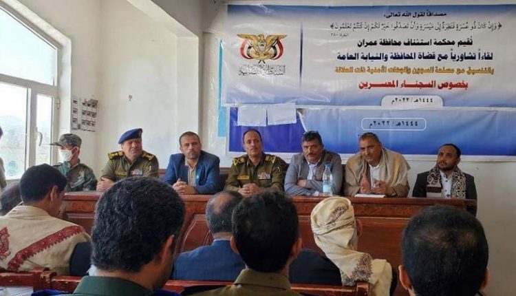 ناقش لقاء تشاوري موسع عقد اليوم الثلاثاء، بمحكمة استئناف محافظة عمران، أوضاع السجناء المعسرين، وإيجاد الحلول لتسديد ما عليهم للغير والإفراج عنهم.