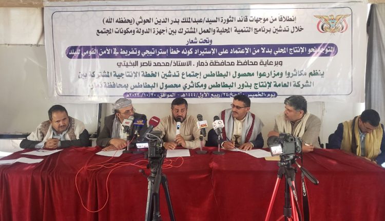 وخلال لقاء تدشيني في شركة البطاطس، ضم قيادة السلطة المحلية ومزارعي ومستوردي البطاطس والجهات الزراعية، أكد محافظ ذمار، محمد ناصر البخيتي، أهمية تضافر الجهود لرفع إنتاجية البطاطس وكافة المحاصيل الزراعية وبما يسهم في تحقيق الأمن الغذائي.