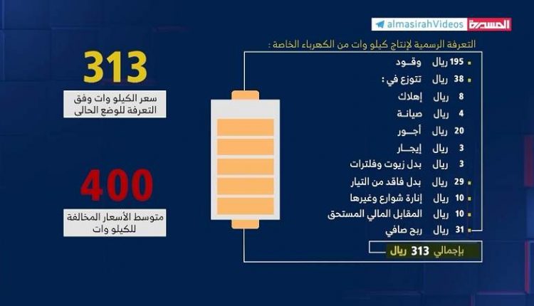وأوضح تحقيق المسيرة الذي يتتبع تفاصيل تعرفة الكهرباء الخاصة بأمانة العاصمة، أن القطاع الخاص يتحصل أرباحا إضافية عن المُقرة في تعرفة الكهرباء بقرابة 3 أضعاف.