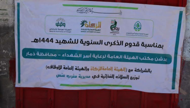 دشن اليوم مكتب الهيئة العامة لرعاية أسر الشهداء بمديرية مغرب عنس بالشراكة مع الهيئة العامة للزكاة والهيئة العامة للاوقاف توزيع السلات الغذائية لأسر الشهداء بالتزامن مع الذكرى السنوية للشهيد للعام 1444هـ