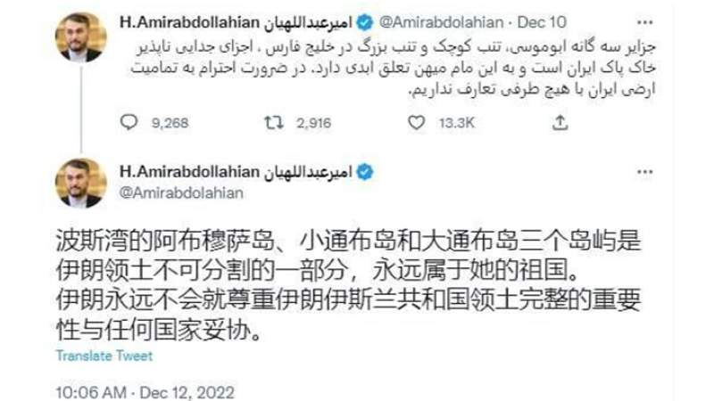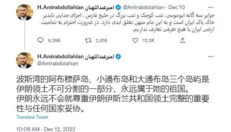 ووفق وكالة “إرنا”، كتب أمير عبد اللهيان في تغريدته ردا على البيان المشترك للصين ومجلس التعاون الخيليجي: تعتبر الجزر الإيرانية الثلاث، أبو موسى وطنب الكبرى وطنب الصغرى، جزء لا يتجزأ من أراضي جمهورية إيران الإسلامية وتنتمي إلى هذا الوطن الأم إلى الأبد، ولا نجامل مع أحد حول وحدة الأراضي الإيرانية.