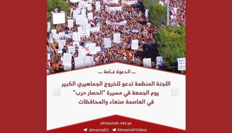 دعت اللجنة المنظمة للفعاليات، أبناء الشعب اليمني إلى الخروج الجماهيري الكبير يوم الجمعة المقبلة، في مسيرات (الحصار حرب) في العاصمة صنعاء والمحافظات.