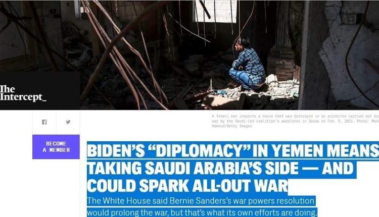 أكد موقع “ذا انترسبت” الأمريكي، أن الدبلوماسية التي ترفعها الإدارة الأمريكية كعنوان لطريقة التعاطي مع الملف اليمني، تعني في الحقيقة الوقوف إلى جانب السعودية والإمارات، وليس البحث عن سلام فعلي، مشيراً إلى أن رفض الولايات المتحدة لمطالب صنعاء المتمثلة بصرف مرتبات الموظفين ورفع الحصار واعتبارها “مطالب غير واقعية” يعبر بوضوح عن عدم جدية واشنطن في التوجـه نحو السلام في اليمن.