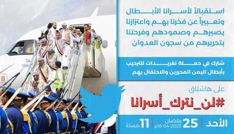 تنطلق مساء اليوم الأحد، حملة تغريدات واسعة، استقبالاً لأسرانا الأبطال وتعبيراً عن فخرنا بهم واعتزازنا بصبرهم وصمودهم، وفرحتنا بتحريرهم من سجون العدوان.