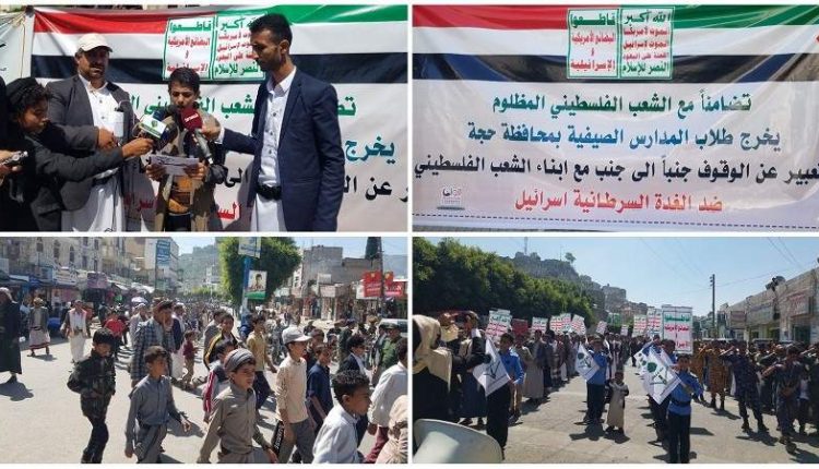 شهدت محافظة حجة اليوم السبت، مسيرات حاشدة لطلاب المدارس والدورات الصيفية المغلقة والنموذجية والمفتوحة تضامناً مع الشعب الفلسطيني.