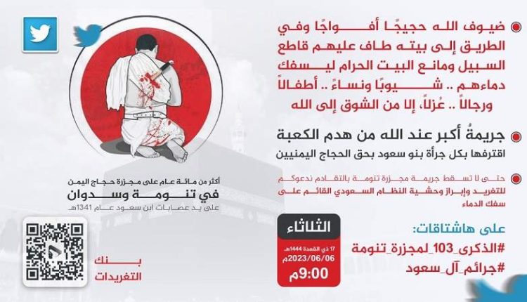 نطلق في الساعة (09:00) من مساء اليوم الثلاثاء، حملة تغريدات على موقع التواصل الاجتماعي “تويتر” في الذكرى الـ103 لمجزرة تنومة وسدوان التي ارتكبها آل سعود بحق أكثر من 3 آلاف حاج يمني.