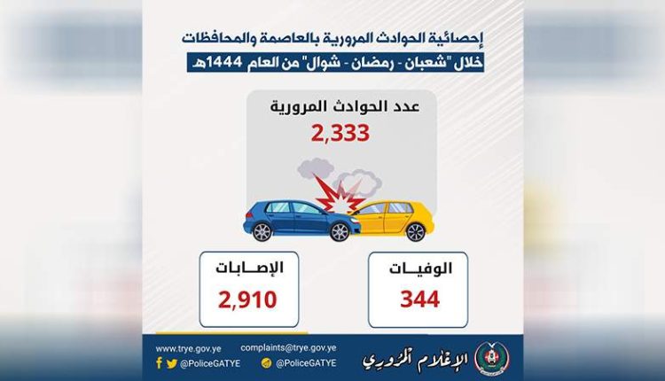 أعلنت الإدارة العامة للمرور وفاة وإصابة ثلاثة آلاف و254 مواطناً جراء ألفين و333 حادث مروري في أمانة العاصمة والمحافظات خلال شعبان، ورمضان، وشوال من العام الهجري الحالي 1444هـ.