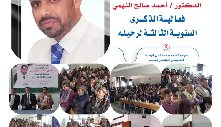 أحيت أسرة وأصدقاء فقيد الوطن الكبير الدكتور أحمد صالح النهمي، عضو مجلس الشورى والأمين العام السابق لإتحاد القوى الشعبية الذكرى السنوية الثالثة لرحيله، بمجمع القاعات الدراسية بمستشفى الوحدة التعليمي الجامعي بمدينة معبر.