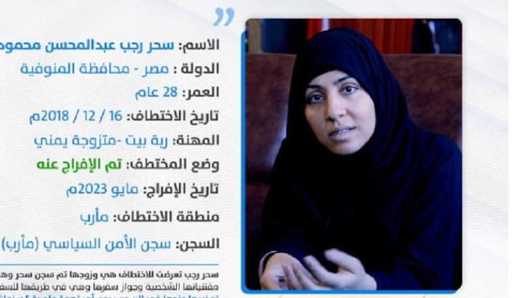 وأوضحت المنظمة في بيان لها “إن المواطنة المصرية سحر رجب عبد المحسن، متزوجة من مواطن يمني وابنتها سماء البالغة من العمر خمس سنوات وصلتا للمنظمة، وأفادت سحر بأنه تم اختطافها في ١٦ ديسمبر ٢٠١٨م وهي حامل في الشهر السادس أثناء سفرها من مطار سيئون إلى محافظة إب مسقط رأس زوجها.