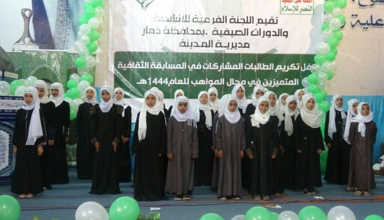 أقامت اليوم الأربعاء الموافق 3 ذو الحجة1444هجريه اللجنة الفرعية للأنشطة والدورات الصيفية للجانب النسائي بمديرية ذمار حفل اختتام للمراكز الصيفية