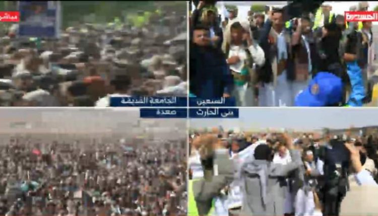 وخرجت المسيرات في محافظة الجوف، إلى ساحة المراشي لأبناء مديريات المراشي والحميدات والعنان ورجوزة بالجوف الأعلى، وساحة الحزم لأبناء مديريات الحزم والخلق والغيل والمصلوب والمتون والزاهر والمطمة وخب الشعف والسيل بالجوف الأسفل.