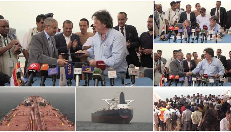 وعقب وصول السفينة عُقد مؤتمر صحفي، تم خلاله توقيع نقل ملكية السفينة البديلة لصافر بين مدير شركة صافر إدريس الشامي، والمنسق المقيم للأمم المتحدة للشؤون الإنسانية في اليمن “وليام ديفيد غريسلي”.