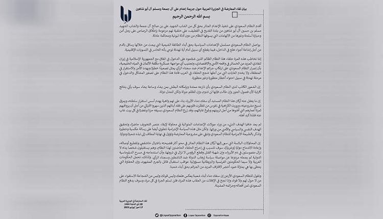 أدان لقاء المعارضة في الجزيرة العربية إعدام النظام السعودي لشابين من بلدة القديح في القطيف على خلفية تهم مزعومة.