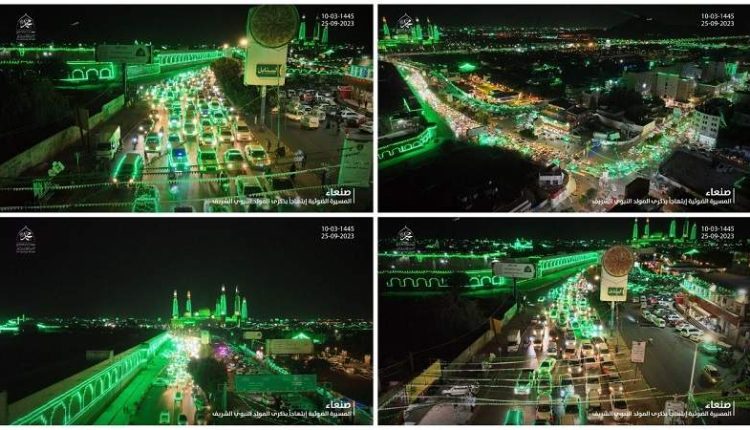 شهدت العاصمة صنعاء مساء الاثنين، مسيرة ضوئية لمئات السيارات المزينة بالأضواء والشعارات الخضراء، ابتهاجاً وفرحاً بقدوم ذكرى المولد النبوي الشريف.