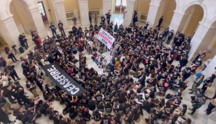 ودخل المتظاهرون القاعة المستديرة الكبيرة في مبنى مكتب كانون هاوس، وهتفوا منديين بالعدوان على غزة، مطالبين بوقف تمويل كيان العدو الصهيوني ليتوقف عن جرائمه بحق الفلسطينيين، فيما قامت الشرطة الأمريكية باعتقال عدد من المتظاهرين.