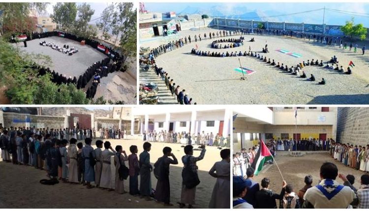 وردد الطلاب في الوقفات بمدارس مديريات المغربة ومبين وشرس ووضرة وريف حجة والمفتاح والجميمة وكحلان الشرف وبني قيس وعبس والمدينة وخيران المحرق و الشغادرة ووشحة وأفلح الشام والشاهل وأسلم، شعارات الغضب وهتافات الاستنكار تجاه ما يتعرض له الفلسطينيون في غزة من جرائم يندى لها الجبين.