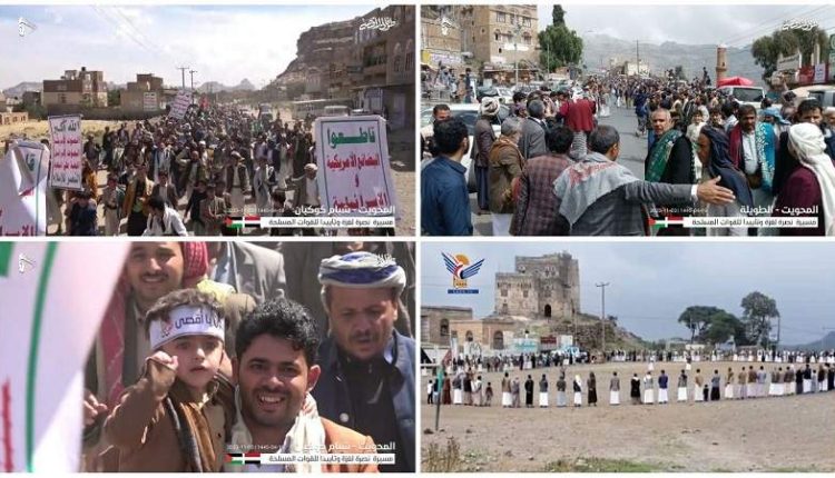 شهدت مديريات الخبت وحفاش والطويلة وشبام كوكبان وملحان والرجم ومدينة المحويت مسيرات ووقفات تضامنية مع الشعب الفلسطيني ومقاومته الباسلة وتأييدا ومباركة للعمليات النوعية التي تنفذها القوات المسلحة ضد الكيان الصهيوني الإسرائيلي.