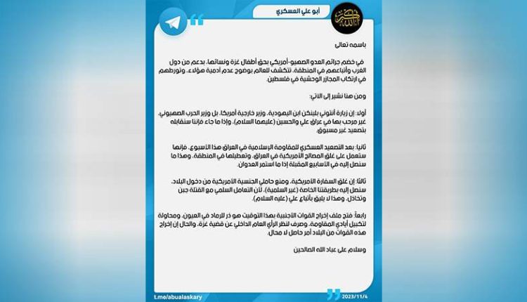 وقال المسؤول الأمني لكتائب حزب الله في العراق، أبو علي العسكري، في بيان نشره في تلجرام، أن “زيارة أنتوني بلينكن “ابن اليهودية”، وزير خارجية أمريكا، بل وزير الحرب الصهيوني، غير مرحب بها في عراق الإمام علي والإمام الحسين (عليهما السلام)، وإذا ما جاء فإننا سنقابله بتصعيد غير مسبوق”.