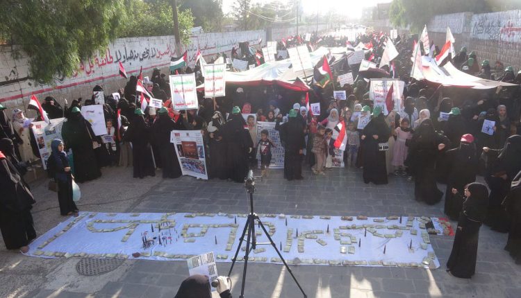 نصرةوتأ يبدأ وتضامنا مع مظلومية أبناء الشعب الفلسطيني الثائر الحر الصامداقامت الهيئة النسائية الثقافية العامة لأنصار الله بمحافظة ذمار بكل مديرياتها اليوم الموافق ٢٥ربيع الثاني ١٤٤٥هجرية وقفة تضامنية مع الشعب الفلسطيني