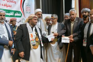 وفي ختام الفعالية قام عضوا المجلس السياسي الأعلى ونائب رئيس حكومة تصريف الأعمال والوزراء وقيادة الهيئة بتسليم الشيك والتبرعات إلى قيادة فصائل المقاومة.