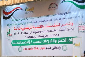 وأعلن عن إطلاق الهيئة وموظفيها حملة الدعم وجمع التبرعات لشعب غزة ومجاهديها بمبلغ مليار و390 مليون ريال، منها 390 مليون ريال قدمها موظفو ديوان عام الهيئة ومكاتبها بالمحافظات استجابة لتوجيهات القيادة الثورية والمجلس السياسي الأعلى وانتصارا للمقدسات والقضية الفلسطينية القضية المركزية للأمة.
