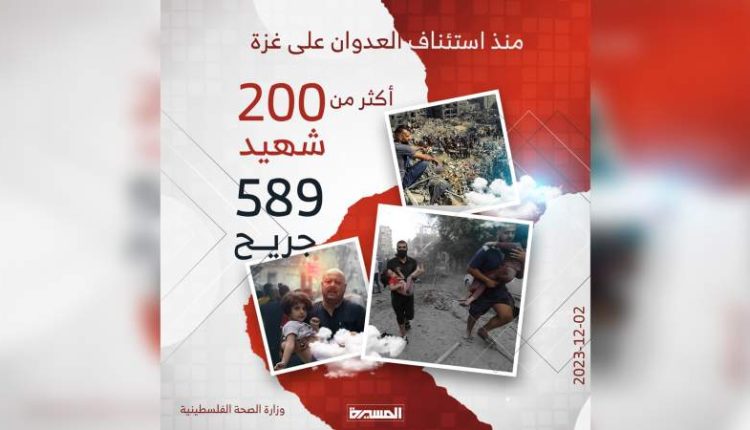 أعلنت وزارة الصحة الفلسطينية في غزة ارتفاع عدد الشهداء إلى 200 والجرحى إلى 589 منذ استئناف العدوان الصهيوني على غزة صباح يوم أمس الجمعة.