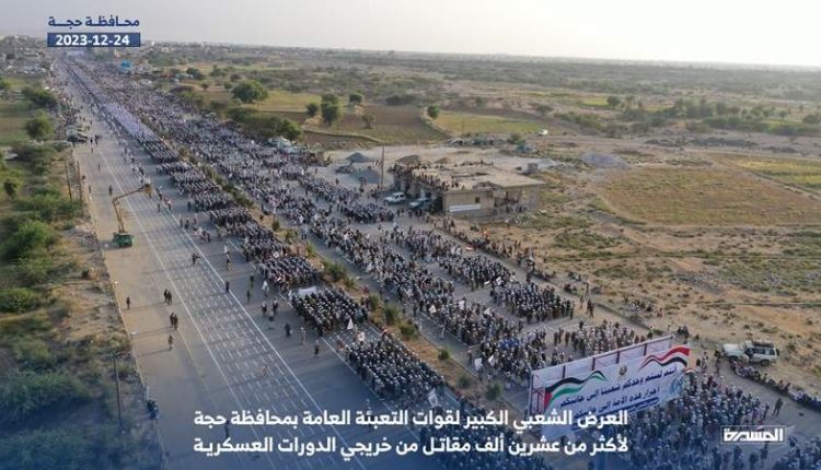 شهدت محافظة حجة، اليوم الأحد، عرضاً شعبياً مسلحاً بمناسبة تخرج أكثر من 20 ألف مجاهد من الدفعة الأولى من الدورات العسكرية المفتوحة “طوفان الأقصى” لقوات التعبئة.