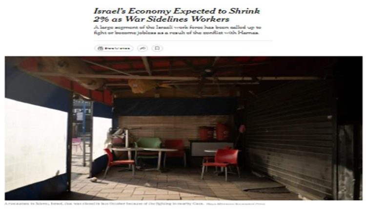 ذكرت صحيفة “نيويورك تايمز” الأمريكية أنه من المتوقع أن ينكمش الاقتصاد الإسرائيلي بنسبة 2%، بسبب تأثير الحرب على العمالة، حيث تم تسريح مئات الآلاف من العمال، بعد الحرب على غزة، أو تم استدعائهم كجنود احتياطيين.