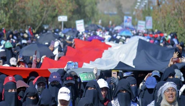 وحمل المشاركون في المسيرة علم فلسطين، مرددين الشعارات والهتافات المنددة بالعدوان الصهيوني الأمريكي على غزة الذي يرتكب أبشع المجازر المروعة بحق أبناء غزة في مشاهد مؤلمة يندى لها جبين الإنسانية، مؤكدين تضامنهم الكامل مع أبناء الشعب الفلسطيني في جهادهم المشروع ضد العدو الصهيوني الغاصب، والوقوف مع الشعب الفلسطيني حتى تحرير كامل أراضيه وعاصمتها القدس الشريف.
