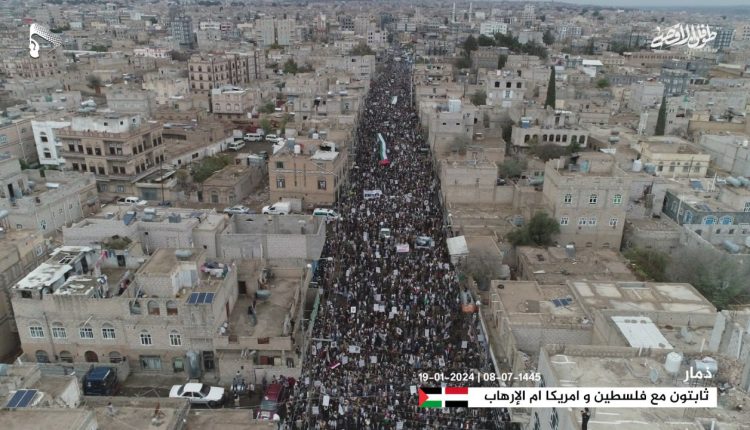 مسيرة جماهيرية حاشدة بذمار تنديداً بالعدوان الامريكي البريطاني وتضامناً مع الشعب الفلسطيني.